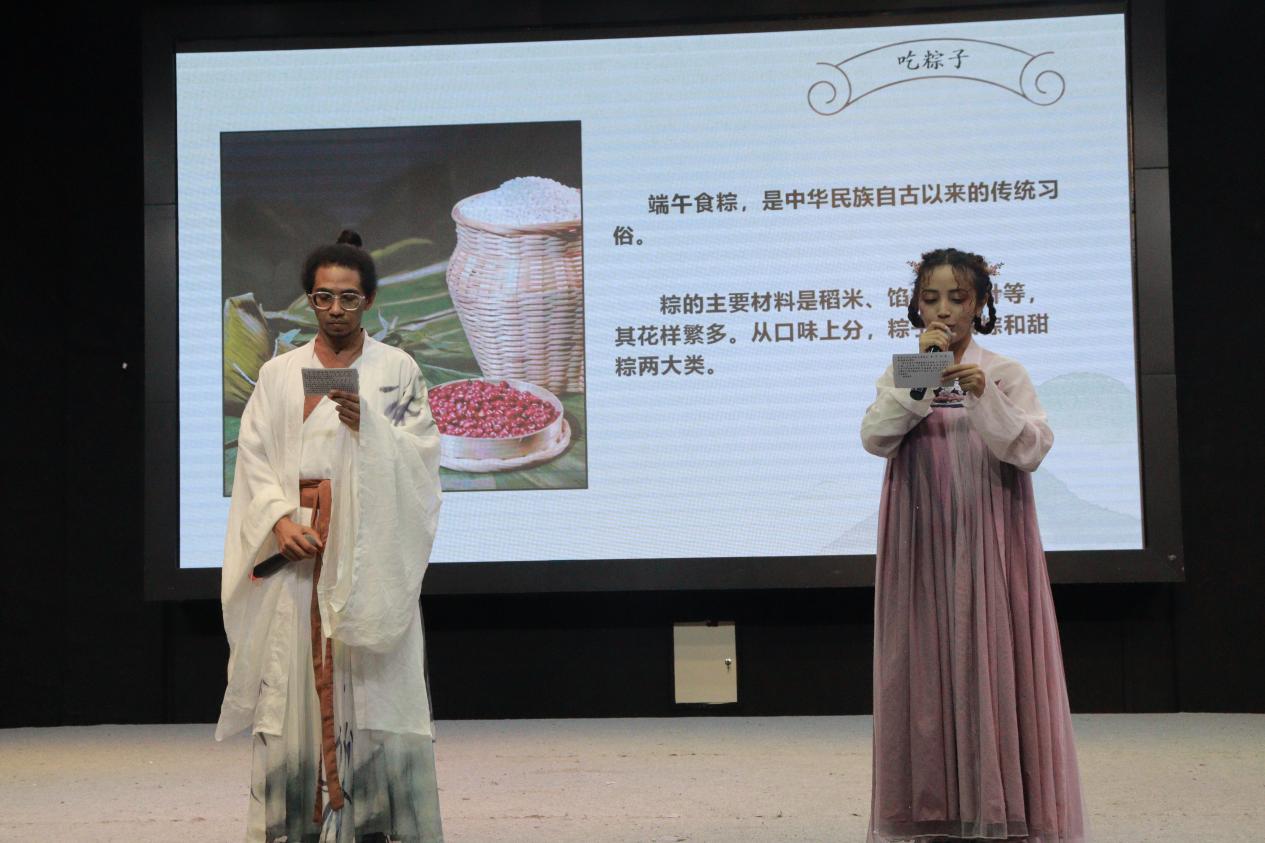 马达加斯加的职工刘晨和文彬合唱暖场歌曲《黑月光》,分享端午节的来源与习俗。