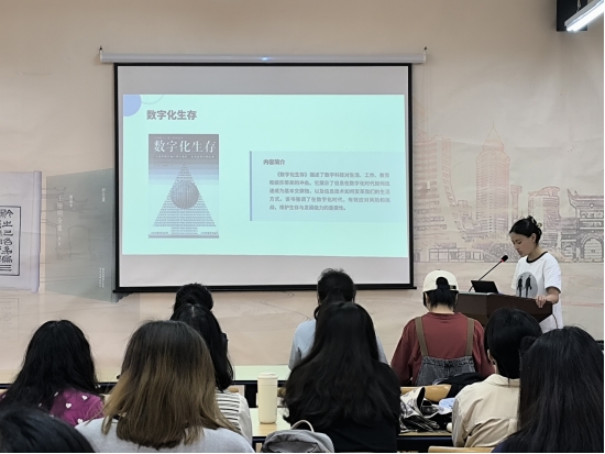 围绕“数字化生存”主题,2023级新闻与传播班的三名研究生进行了学术分享。阳金凤以“如何保护全媒体时代的数字版权”为话题,指出互联网和全媒体便利了数字内容传播,但也给版权保护带来挑战。基于此,她提出利用区块链技术保护数字作品版权。