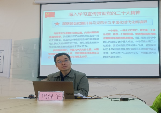 报告会上,代泽华从党的二十大的重大意义、大会主题、过去五年的工作和新时代十年的伟大变革、开辟马克思主义中国化时代化新境界、新时代新征程中国共产党的使命任务、中国式现代化的中国特色和本质要求、全面建设社会主义建设化国家的目标任务、坚持党的全面领导和全面从严治党等八个方面进行宣讲阐释。
