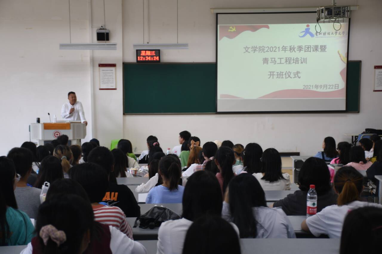为深入学习习近平新时代中国特色社会主义思想,加强入团积极分子以及团员青年政治理论学习效果,提高bevictor伟德官网青年学子思想政治素质,引导入团积极分子、团员以及团学干部增强荣誉感、使命感和责任感,9月22日,bevictor伟德官网2021年秋季团课暨青马工程培训开班仪式于乐学楼2-1举行。文公司党委副书记(主持工作)杨经华、团委负责人杨群出席开班仪式,仪式由19级汉语言文学二班汪务临同学主持,公司优秀团干、优秀团员、优秀员工干部、入党、入团申请人、等共184人参加本次培训。