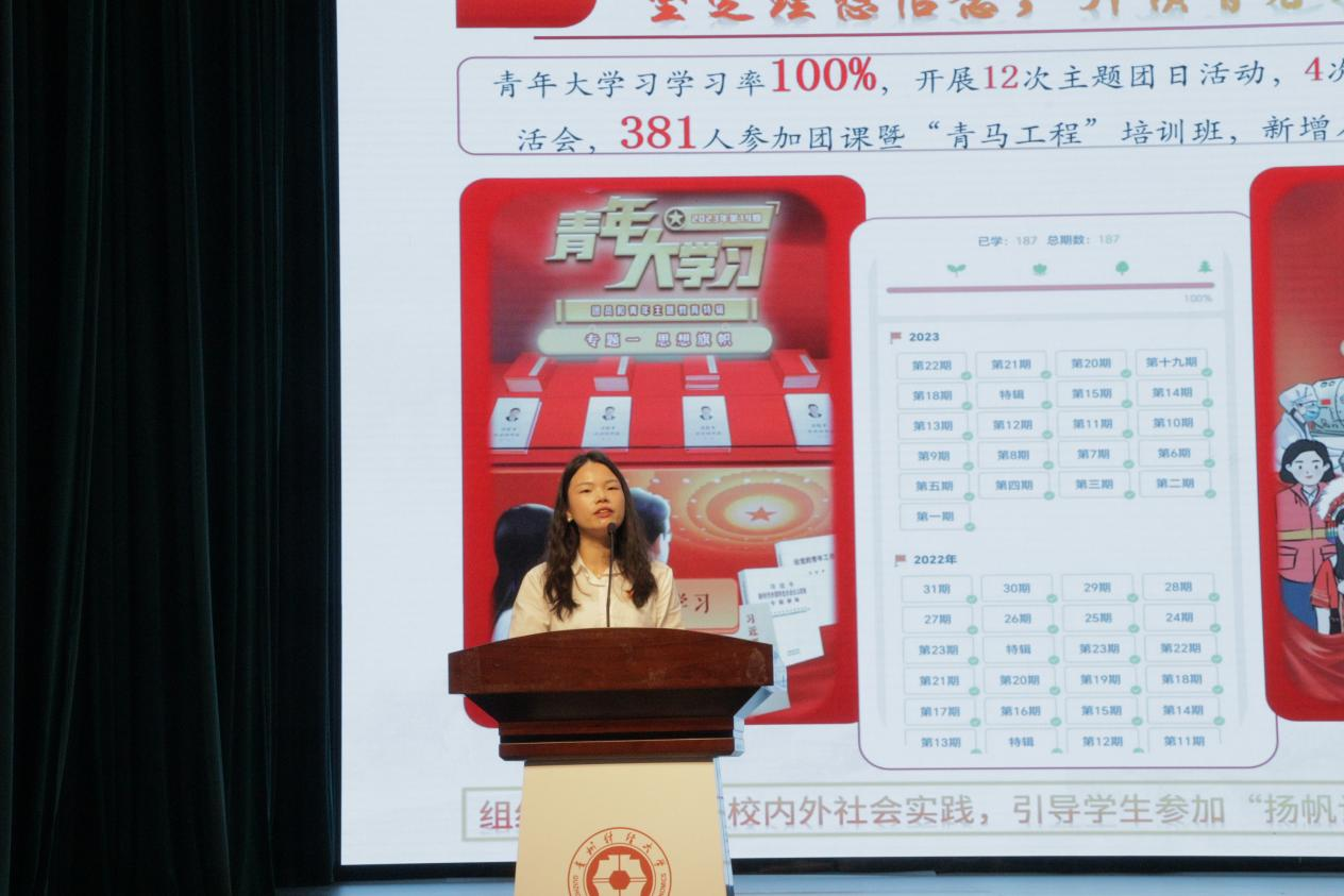 表彰大会在庄严的团歌声中拉开帷幕。院团委负责人杨群作2023年bevictor伟德官网团委工作报告,汇报了bevictor伟德官网团委在思想引领、组织建设、实践育人等方面取得的成效。