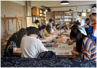 随后,全体教职工在驻馆苗族手艺人的带领下进行了手工画蜡体验,并现场在40CM大小的面布上体验画蜡画,老师们在制作蜡画时与当地苗族手艺人进行了交流。教职工通过这样的方式对画腊手法进行了深入体验,在切身的体验中融入了当地的文化氛围,感受当地独具特色的蜡染非遗文化。