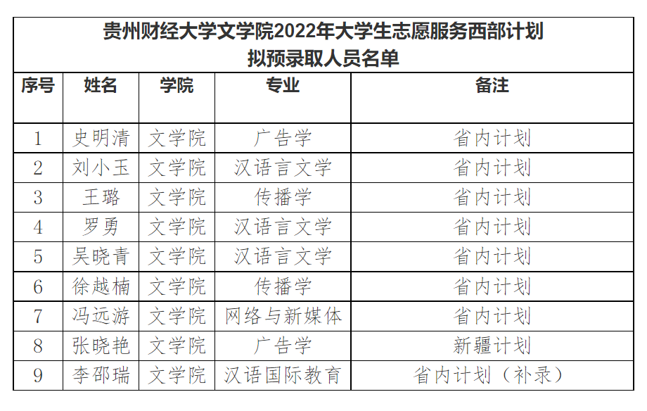 附件:bevictor伟德官网2022年老员工志愿服务西部计划拟预录取人员名单