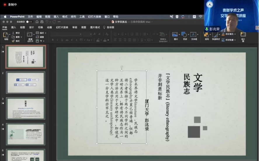 2022年9月20日下午,厦门大学教授,博士生导师,“巴渝学者”特聘教授,著名人类学者彭兆荣教授应邀做客公司“人文论坛”,做了题为《文学民族志》的学术讲座,讲座采取线上形式,由文公司党委书记杨经华主持,全校320余名师生聆听了讲座。